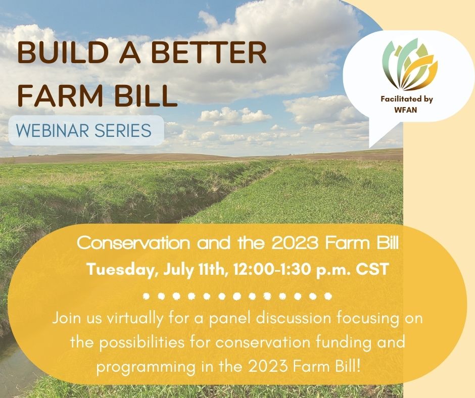 Join us for a series of virtual panel discussions with agricultural experts across the field to talk about how we build our better farm bill. A farm bill where issues of workers rights, equity, water quality and soil health are on the table. WFAN will host four separate sessions throughout June and July to highlight different components of sustainable agriculture that might be covered by the 2023 Farm Bill and offer folks the opportunity to share their concerns and questions with our panelists. All events will be hosted from 12:00-1:30 CT.