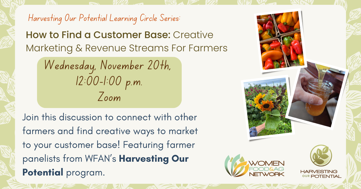 In this Lunch & Learn, mentors from WFAN's Harvesting Our Potential Program will discuss creative farm business marketing, sharing their ideas and experiences diversifying revenue streams. Through farmer-focused discussions with panelists, we hope farmers will leave with new ideas for creative marketing, resources for exploring new business avenues, and a network of new farmer connections. Participation will be capped at 60 attendees, so register now to secure your spot!