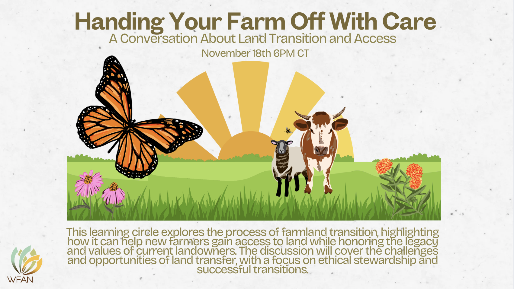Join us November 18th at 6PM CT/7PM ET for a conversation about land transition as a form of land access and keeping land in ethical and caring hands.