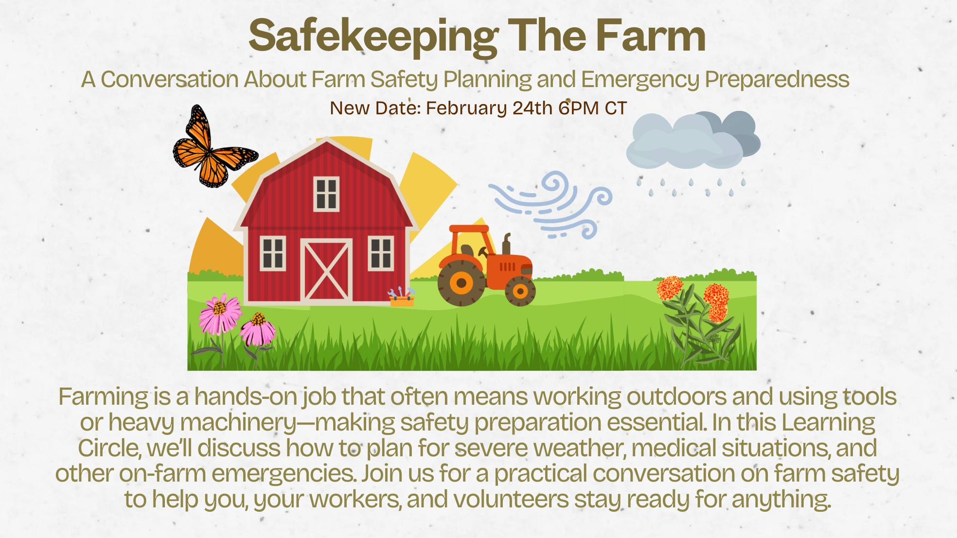 During this learning circle we will navigate discussion around making plans for severe weather, medical emergencies, and other emergencies that may happen on the farm. Join us for this conversation to discuss all things farm safety related.